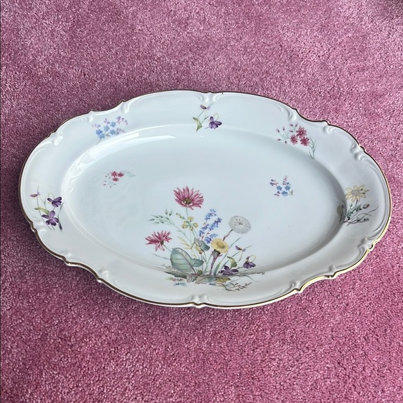 1920s to 1930s Hutschenreuther Fine China serving platter of Selb, Bavaria, Germany. Imported by Paul A Straub Co (PASCO) of New York. Pattern 8940, Sylvia, white, multicolored. Numbered piece 68. Platter is 15” long, 10 1/4” wide, and 1 1/2” deep.